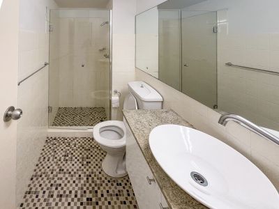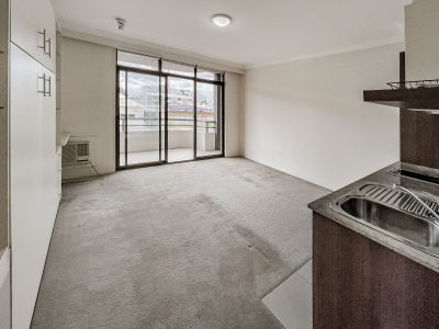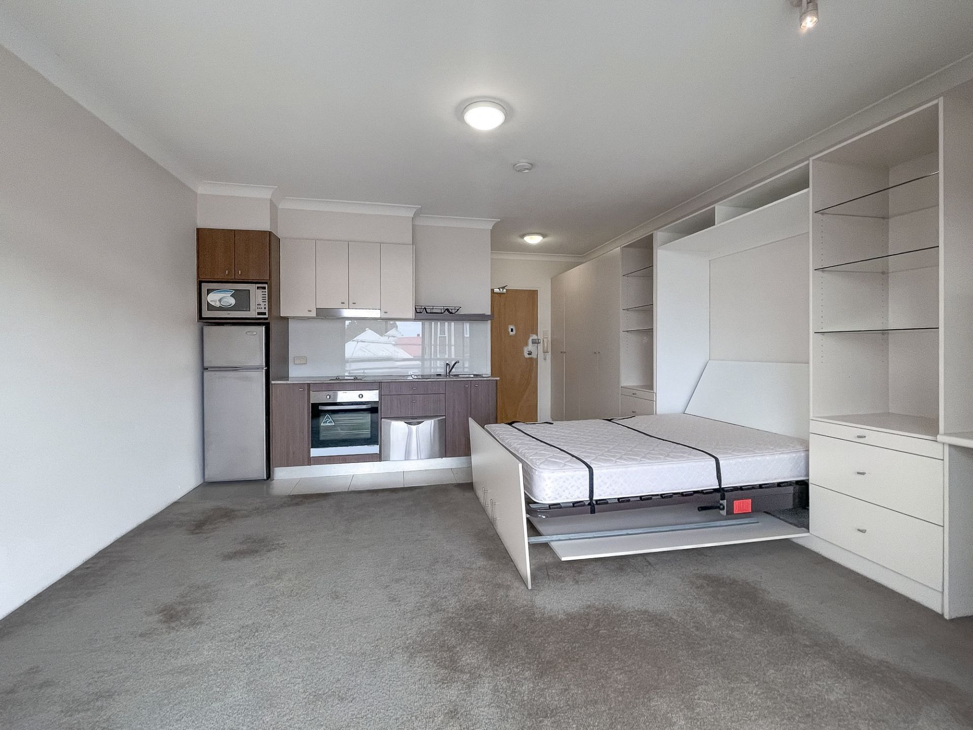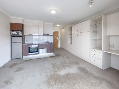 This studio offers level lift access, open plan layout with pull-down bed, integrated joinery, desk and storage, neat kitchenette, bathroom with separate shower and balcony with lovely district outlook.