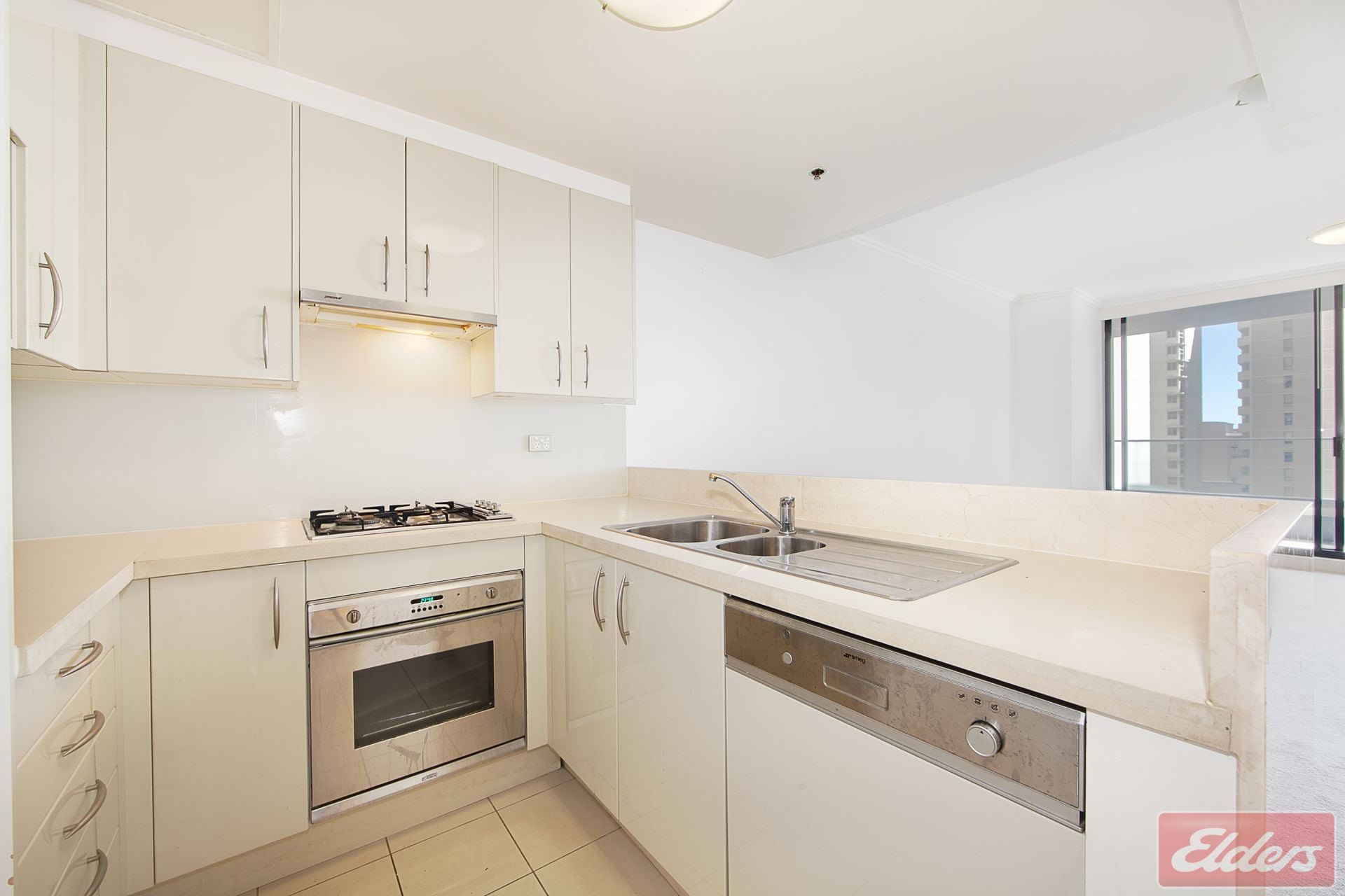 * Stylish solid stone overlay benchtops with gas cooktop, rangehood with outside ducting.